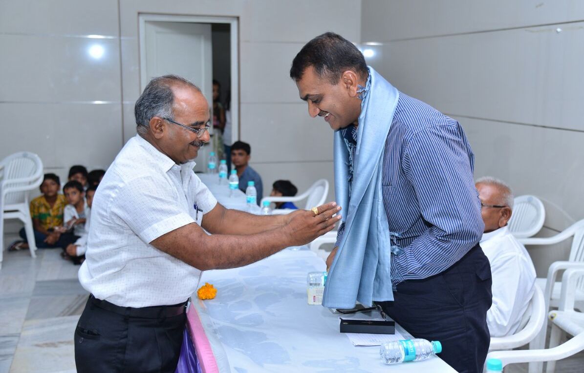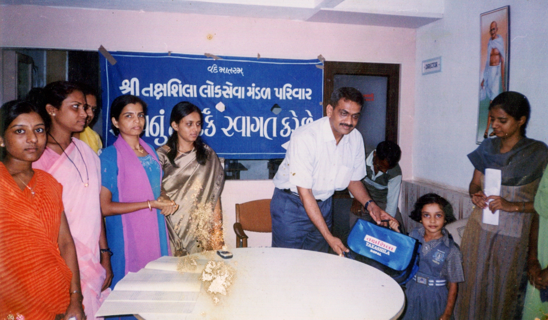 School bags donation by Manhar Patel (Chairman, Shri Taxashila Lokseva Mandal).